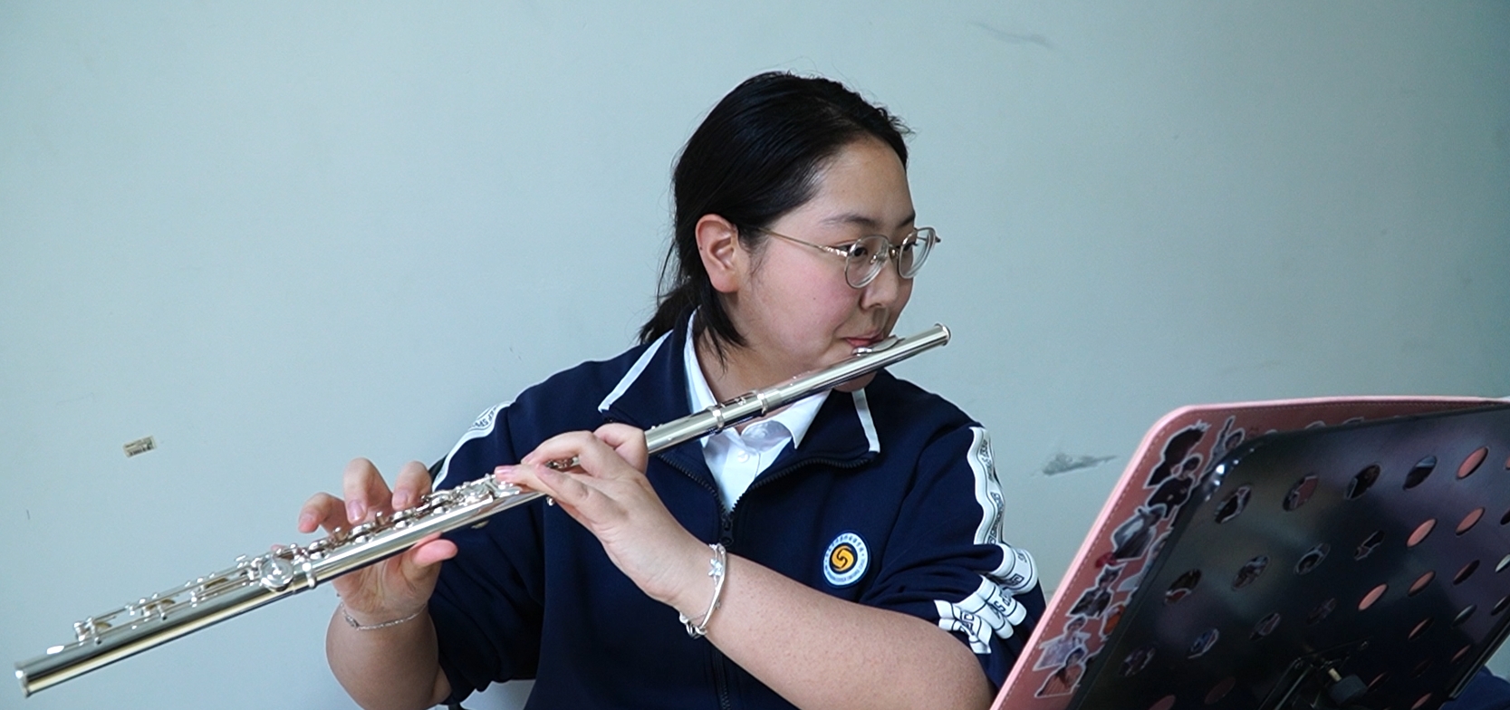 长笛课上,学生在老师指导下拆解擦拭乐器。随着学习深入,学生练习指法组合,左手按孔、右手按键,紧盯乐谱数节拍,杂乱音符渐趋整齐,清澈乐声回荡教室。