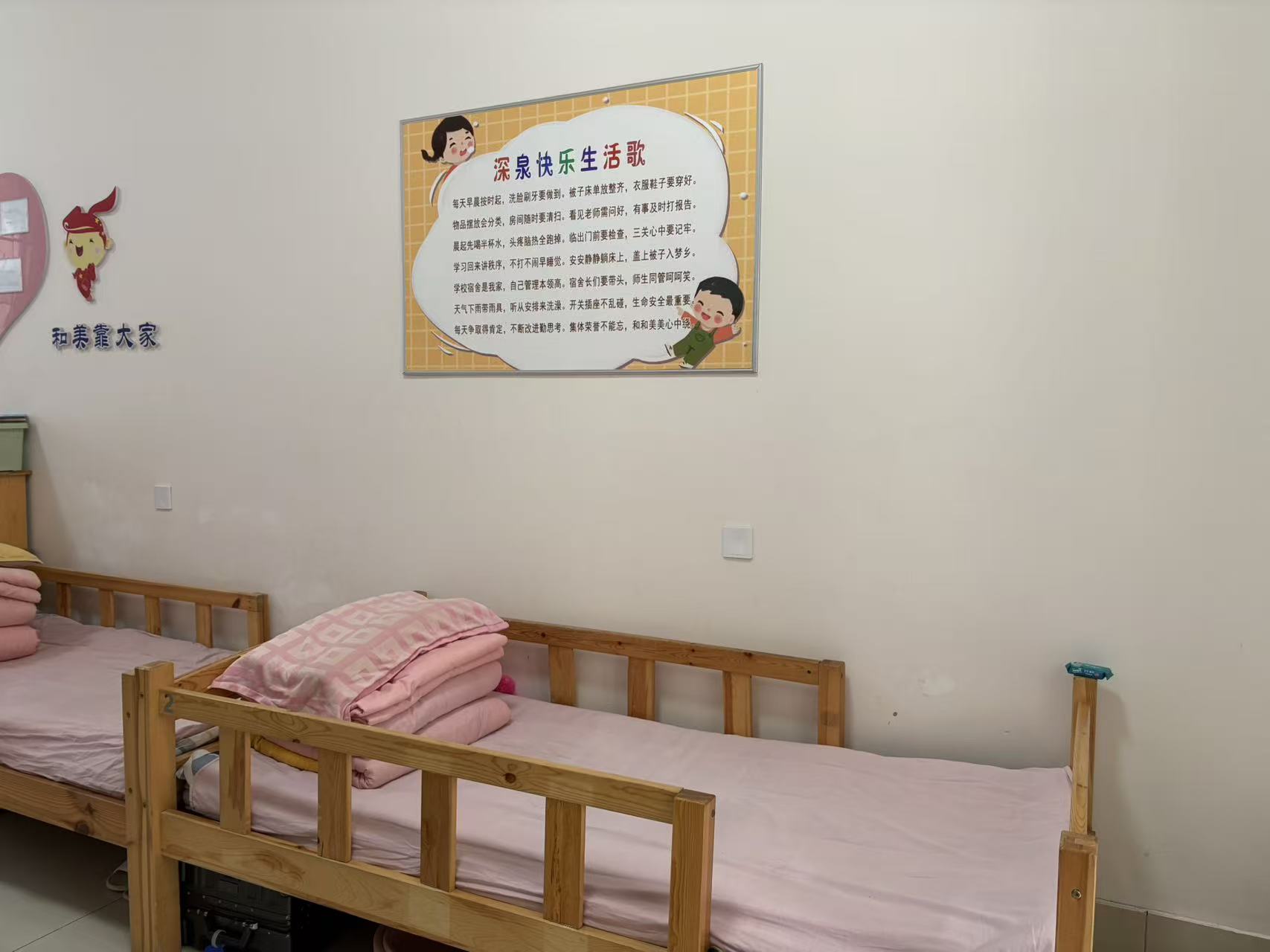 在这里,有伙伴间的相伴,有老师如同家人般的妥帖照料,有插画标语的温柔引导、有成长的细碎痕迹、有漫溢的书香。深泉小学部的宿舍,更像孩子们在校园里的另一个“家”,妥帖安放着他们的日常,祝愿每一个深泉小朋友,都能在这满是暖意的校园天地里,快乐相伴,健康成长!