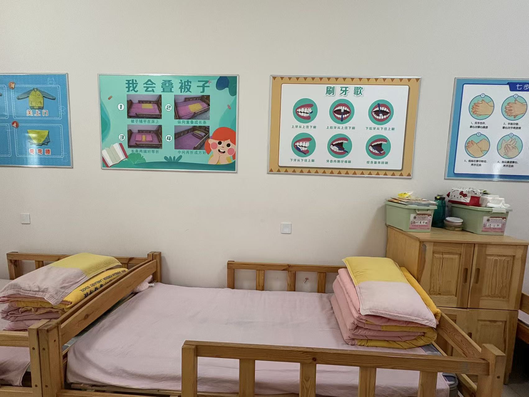 小学部宿舍墙面挂着的《刷牙歌》图文挂饰格外显眼,可爱的图案与字句里,藏着学校引导孩子们认真打理自己的心意。《深泉快乐生活歌》的字句缀在其间,彰显出对孩子们的细心关爱与周到体贴;《我会叠被子》 四张实拍照片依次记录叠被步骤:摊平被子、纵向重叠、两端对折、中间再对折。详细而又准确的教会小朋友叠被子的方法。